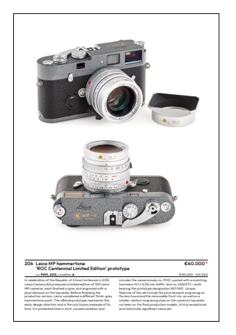 206 Leica MP hammertone %u20ac40.000*%u2018ROC Centennial Limited Edition%u2019 prototype no. P001, 2012, condition A %u20ac 80.000 %u2013 100.000In celebration of the Republic of China Centennial in 2012, Leica Camera AG produced a limited edition of 100 Leica MP cameras, each finished in grey and engraved with aplum blossom on the top plate. Before finalizing theproduction version, Leica considered a different finish: greyhammertone paint. The offered prototype represents thisearly design direction and is the only known example of its kind. It is presented here in mint, unused condition and includes the camera body no. P001, paired with a matching Summilux-M 1:1.4/35%u2009mm ASPH. lens no.%u20094320373%u2009%u2014%u2009bothbearing the prototype designation N01/N01. Uniquefeatures of this set include the plum blossom engraving on the lens hood and the removable front rim, as well as a smaller, distinct engraving style on the camera%u2019s top plate, not seen on the final production models. A truly exceptionaland historically significant Leica set.