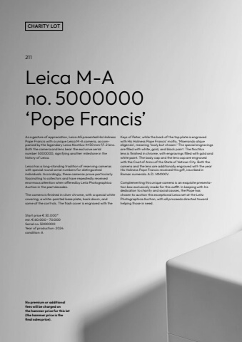 102CHARITY LOTNo premium or additional fees will be charged on the hammer price for this lot (the hammer price is the final sales price).211Leica M-A no. 5000000 %u2018Pope Francis%u2019 As a gesture of appreciation, Leica AG presented His Holiness Pope Francis with a unique Leica M-A camera, accompanied by the legendary Leica Noctilux-M 50%u2009mm f/1.2 lens.Both the camera and lens bear the exclusive serial number 5000000, signifying another milestone in the history of Leica.Leica has a long-standing tradition of reserving cameras with special round serial numbers for distinguished individuals. Accordingly, these cameras prove particularly fascinating to collectors and have repeatedly received enormous attention when offered by Leitz PhotographicaAuction in the past decades.The camera is finished in silver chrome, with a special whitecovering, a white-painted base plate, back doors, and some of the controls. The flash cover is engraved with theKeys of Peter, while the back of the top plate is engraved with His Holiness Pope Francis%u2019 motto, %u2018Miserando atqueeligendo%u2019, meaning %u2018lowly but chosen.%u2019 The special engravings are filled with white, gold, and black paint. The Noctiluxlens is finished in chrome, with engravings filled with gold andwhite paint. The body cap and the lens cap are engraved with the Coat of Arms of the State of Vatican City. Both the camera and the lens are additionally engraved with the year His Holiness Pope Francis received this gift, inscribed in Roman numerals: A.D. MMXXIV.Complementing this unique camera is an exquisite presentation box exclusively made for thisoutfit. In keeping with hisdedication to charity and social causes, the Pope has chosen to auction this exceptional Leica set at the Leitz Photographica Auction, with all proceeds directed toward helping those in need.Start price %u20ac 30.000*est. %u20ac 60.000%u2013 70.000Serial no. 5000000Year of production: 2024condition: A