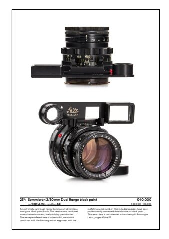 234 Summicron 2/50 mm Dual Range black paint %u20ac40.000no.1832942, 1961, condition A/B %u20ac 80.000 %u2013 100.000An extremely rare Dual-Range Summicron 50 mm lens in%u00a0original black paint finish. This version was producedin very limited numbers, likely only by special order. The example offered here is in beautiful, near-mintcondition, with the focusing mount engraved with the matching serial%u00a0number. The included goggles have beenprofessionally converted from chrome to black paint. This exact lens is documented in Lars Netopil%u2019s Prototype Leica, pages%u00a0436%u2013437.