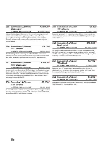 116238 Summilux 1.4/50 mm %u20ac1.200*11114 chrome no.1757898, 1960, condition B/A %u20ac 2.400 %u2013 2.800M-mount Summilux 50%u2009mm in very good%u00a0condition, very good opticsshowing minimal cleaning marks, with both caps and hood XOOIM, delivered on 28.10.1960 to Leitz Canada.239 Summilux 1.4/50 mm %u20ac1.20011114 chromeno.1884532, 1961, condition A%u2013 %u20ac 2.400 %u2013 2.800Beautiful quite early M-mount Summilux 50 mm in mint condition, clean and clear optics, with front cap, hood 12521G, plastic keeper and maker%u2019s box.240 Summilux 1.4/50 mm %u20ac10.000*black paint no. 2039939, 1967, condition B+ %u20ac 16.000 %u2013 20.000An original, rare black paint Summilux 50 mm, delivered on June 20, 1967, to New York. In good original condition, with a patina of small bubbles appearing in the painted elements, very good optics, including a 12521G hood and metal rear cap.235 Summicron 2/50 mm %u20ac12.000*black paint no. 2142159, 1966, condition A/B %u20ac 20.000 %u2013 24.000A beautiful black paint Summicron 50 mm with amazing minimal patina and small bubbles appearing in the paint, with very good optics, including%u00a0a matching brass / black paint cap (alsoshowing small bubbles), black paint ITDOO hood, rear cap and plastic%u00a0keeper.236 Summicron 2/50 mm %u20ac4.00011817 chromeno. 2314772, 1970s, condition A/B %u20ac 8.000 %u2013 9.000An interesting chrome focusing mount of the 11817 Summicron (serial production of this version in black only), with an earlier 1969 lens head, excellent condition with good optics, with rear cap.237 Summicron 2/50 mm %u20ac4.000*11817 black paint no. 2434243, 1970, condition A%u2013 %u20ac 8.000 %u2013 10.000An extremely rare Summicron 11817 with both the focusing ring and depth-of-field ring finished in black paint. The lens is in beautiful,near-mint condition. The only other example of a Summicron 11817 in this finish we have encountered was just a few numbers apart,with serial number 2434233.241 Summilux 1.4/50 mm %u20ac1.400*11114 black no. 2309662, 1968, condition A%u2013 %u20ac 2.800 %u2013 3.200Beautiful rare 2nd version black anodized Summilux 50 mm, in absolutely mint condition, clean and clear optics, with hood, front lens cap, plastic keeper and original maker%u2019s box.242 Summilux 1.4/50 mm %u20ac1.000*no.1845838, 1961, condition A/B %u20ac 2.000 %u2013 2.400In excellent condition and with very good optics, including a keeper, 12521G hood, UV filter and front cap.
