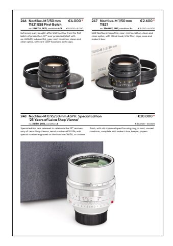 246 Noctilux-M 1/50 mm %u20ac4.000*11821 E58 First Batch no. 2749718, 1975, condition A/B %u20ac 8.000 %u2013 9.000Extremely early sought-after E58 Noctilux from the firstbatch of production, 87th ever produced (start with no.%u2009249631), in beautiful, near-mint%u00a0condition, clean andclear optics, with rare 12519 hood and both caps.247 Noctilux-M 1/50 mm %u20ac2.600*11821no. 3569487, 1991, condition A%u2013 %u20ac 5.000 %u2013 6.000E60 Noctilux in beautiful, near-mint condition, clean and clear optics, with 12544 hood, UVa filter, caps, case andmaker%u2019s box.248 Noctilux-M 0.95/50 mm ASPH. Special Edition %u20ac20.000*%u201825 Years of Leica Shop Vienna%u2019 no. 34/50, 2016, condition A %u20ac 36.000 %u2013 40.000Special edition lens released to celebrate the 25th anniversary of Leica Shop Vienna, serial number 4970034, with special number engraved on the front rim 34/50, in chromefinish, with old style scalloped focusing ring, in mint, unusedcondition, complete with maker%u2019s box, keeper, papers.