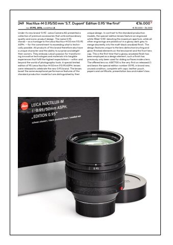 249 Noctilux-M 0.95/50 mm %u2018S.T. Dupont%u2019 Edition 0.95 %u2018the first%u2019 %u20ac16.000*no.01/95, 2016, condition A %u20ac 30.000 %u2013 34.000Under its new brand %u20180.95%u2019, Leica Camera AG presented a collection of premium accessories that unite extraordinary quality and iconic product design. The name 0.95 stands%u2009%u2014%u2009as a homage to the Leica Noctilux-M 50%u2009mm f/0.95ASPH. %u2014 for the commitment to exceeding what is technically possible. All products of this brand therefore also have a unique character and the ability to surprise and delight their owners. They embody Leica%u2019s passion for transforming innovative technologies and materials into tangible experiences that fulfil the highest expectations%u2009%u2014%u2009within andbeyond the world of photographic tools. A special limited edition of 95 Leica Noctilux-M 50%u2009mm f/0.95 ASPH. lenseswere released to celebrate the new 0.95 brand. The lenses boast the same exceptional performance features of the standard production model but are distinguished by their unique design. In contrast to the standard production models, the special-edition lenses feature an engraved white-filled %u20180.95%u2019 denoting the maximum aperture, while allother engravings are picked out in a glossy dark grey to merge discreetly into the matt-black anodized finish. Thedesign features unique to the lens distinctive knurling and gloss-finished elements on the lens barrel and the front lenscap. This is the first time that a glossy anodized finish hasbeen employed as a design element; such a finish haspreviously only been used for sliding surfaces inside a lens. The offered lens no.%u20094587700%u00a0is the very first on released (!)and bears the special edition number 01/95, in brand new,unused condition, complete with caps. leather pouch, papers and certificate, presentation box and maker%u2019s box.