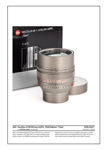 250 Noctilux 0.95/50 mm ASPH. 11612 Edition %u2018Titan%u2019 %u20ac30.000*no.039/100, 2023, condition A %u20ac 60.000 %u2013 70.000Very rare limited edition Noctilux 0.95/50%u2009mm in titaniumfinish, limited to only 100 units, in unused condition, withserial number no.%u20094836322 and special number 039/100engraved on the front ring, complete with papers, certificate of authenticity, both special titanium caps, front lens cap, leather pouch, presentation and maker%u2019s boxes.