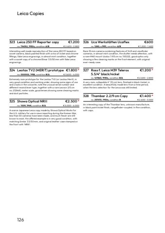 126324 Leotax TV2 (MERIT) prototype %u20ac1.800*no.000002, 1958, condition B/A %u20ac 3.600 %u2013 4.000Extremely rare prototype for the Leotax TV2%u00a0(or Leotax Merit),%u00a0invery good condition and working order, showing some signs of use and cracks in the vulcanite, note the unusual serial number and different rewind lever type, together with a rare Leonon 2/5%u2009cmno.%u2009232465, meter scale, good lenses showing%u00a0some cleaning marksand dust particles.325 Showa Optical NRIII %u20ac2.500*no.1009, 1949, condition B/A %u20ac 5.000 %u2013 6.000A scarce Japanese Leica copy made by Showa Optical Works for the U.S. military for use in news reporting during the Korean War, less than 50 cameras have been made, and much fewer are still known to exist, the offered example is in very good condition, withmatching Simlar 3.5/50 mm, and original leather case stamped on the front with %u2018NRIII%u2019.326 Uca Werkst%u00e4tten Ucaflex %u20ac600no.1280, c.1951, condition A/B %u20ac 1.200 %u2013 1.400Rare 35%u2009mm camera combining features of SLR and viewfindercameras, in almost mint condition, the shutter needs attention, witha rare M40 mount Ucalux 1.9/5 cm no.100222, good optics only showing a few cleaning marks on the front element, with%u00a0originalever-ready case.327 Ross f. Leica M39 Teleros %u20ac1.200*5.5/4\no.127863, 1930s, condition B/A %u20ac 2.400 %u2013 2.800A very rare, collapsible 4\excellent condition. A beautifully made lens from a time period, when the lens selection for the Leica was still limited.328 Thambar 2.2/9 cm Copy %u20ac1.400*no. 257013, 1950s, condition B %u20ac 2.600 %u2013 3.000An interesting copy of the Thambar lens, unknown manufacture,in black paint/nickel finish, rangefinder-coupled. In fine condition,with caps.323 Leica 250 FF Reporter copy %u20ac1.200no.114052, 1950s, condition A/B %u20ac 2.400 %u2013 2.800Interesting well made reproduction of the Leica 250 FF%u00a0based onsoviet%u00a0camera, black painted finish with a mix of nickel and chromefittings, fake Leica engravings, in almost mint condition, togetherwith a soviet copy of a chrome Elmar 3.5/50 mm with fake Leica engravings.Leica Copies