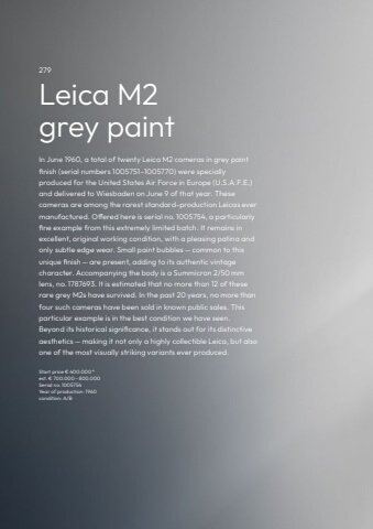 138279Leica M2 grey paint In June 1960, a total of twenty Leica M2 cameras in grey paint finish (serial numbers 1005751%u20131005770) were speciallyproduced for the United States Air Force in Europe (U.S.A.F.E.) and delivered to Wiesbaden on June 9 of that year. These cameras are among the rarest standard-production Leicas ever manufactured. Offered here is serial no.%u20091005754, a particularlyfine example from this extremely limited batch. It remains inexcellent, original working condition, with a pleasing patina and only subtle edge wear. Small paint bubbles %u2014 common to this unique finish%u2009%u2014%u2009are present, adding to its authentic vintagecharacter. Accompanying the body is a Summicron 2/50%u2009mmlens, no.1787693. It is estimated that no more than 12 of these rare grey M2s have survived. In the past 20 years, no more than four such cameras have been sold in known public sales. This particular example is in the best condition we have seen. Beyond its historical significance, it stands out for its distinctiveaesthetics %u2014 making it not only a highly collectible Leica, but also one of the most visually striking variants ever produced.Start price %u20ac 400.000*est. %u20ac 700.000%u2013 800.000Serial no.1005754Year of production: 1960condition: A/B