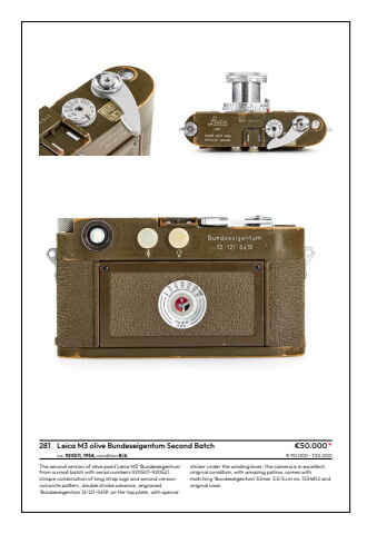 281 Leica M3 olive Bundeseigentum Second Batch %u20ac50.000*no. 920511, 1958, condition B/A %u20ac 90.000 %u2013 100.000The second%u00a0version of olive paint Leica M3 %u2018Bundeseigentum%u2019from a small batch with serial numbers 920501-920521. Unique combination of long strap lugs and second version vulcanite pattern, double stroke advance, engraved%u2018Bundeseigentum 12-121-5418%u2019 on the top plate, with special sticker under the winding lever, the camera is in excellent, original condition, with amazing patina, comes with matching %u2018Bundeseigentum%u2019 Elmar 3.5/5%u2009cm no.%u20091334812 andoriginal case.