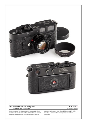 287 Leica KE-7A %u2018US Army%u2019 set %u20ac18.000*no.1294717, 1972, condition A/B %u20ac 30.000 %u2013 34.000A rare variant of the black Leica M4, produced by Ernst Leitz Canada for the U.S. military. In beautiful, near-mint condition, body engraved with the US military contract numbers,%u00a0with%u00a0sought-after Elcan 2/50%u2009mm no.%u2009276-0115,including a rare and often missing original hood and front%u00a0cap.