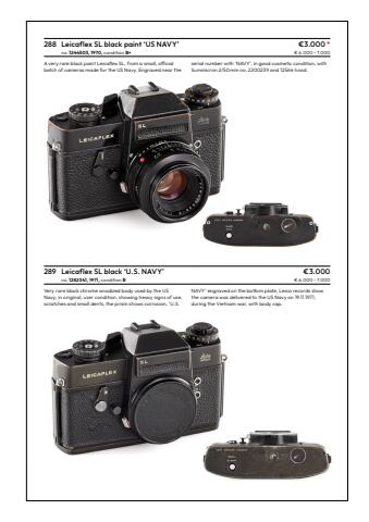 289 Leicaflex SL black %u2018U.S. NAVY%u2019 %u20ac3.000no.1282341, 1971, condition B %u20ac 6.000 %u2013 7.000Very rare%u00a0black chrome anodized body used by the USNavy, in original, user condition, showing heavy signs of use, scratches and small dents, the prism%u00a0shows%u00a0corrosion, %u2018U.S.NAVY%u2019 engraved on the bottom plate, Leica records showthe camera was delivered to the US Navy on 19.11.1971, during the Vietnam war, with body cap.288 Leicaflex SL black paint %u2018US NAVY%u2019 %u20ac3.000*no.1244503, 1970, condition B+ %u20ac 6.000 %u2013 7.000A very rare black paint Leicaflex SL, from a small, officialbatch of cameras made for the US Navy. Engraved near the serial number with %u2018NAVY%u2019, in good cosmetic condition, with Summicron 2/50%u2009mm no.%u20092200239 and 12564 hood.