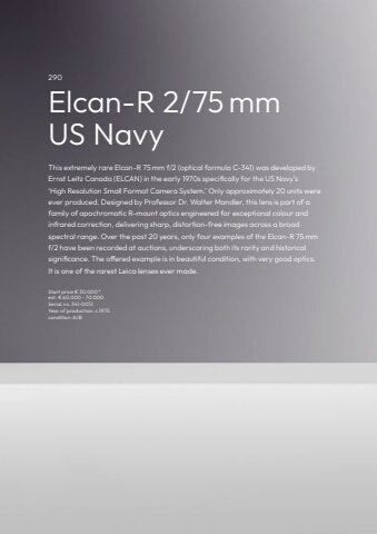 148290Elcan-R 2/75%u2009mmUS Navy This extremely rare Elcan-R 75%u2009mm f/2 (optical formula C-341) was developed byErnst Leitz Canada (ELCAN) in the early 1970s specifically for the US Navy%u2019s%u2018High Resolution Small Format Camera System.%u2019 Only approximately 20 units were ever produced. Designed by Professor Dr. Walter Mandler, this lens is part of a family of apochromatic R-mount optics engineered for exceptional colour and infrared correction, delivering sharp, distortion-free images across a broadspectral range. Over the past 20 years, only four examples of the Elcan-R 75mm f/2 have been recorded at auctions, underscoring both its rarity and historicalsignificance. The offered example is in beautiful condition, with very good optics.It is one of the rarest Leica%u00a0lenses ever made.Start price %u20ac 30.000*est. %u20ac 60.000%u2013 70.000Serial no. 341-0013Year of production: c.1975condition: A/B