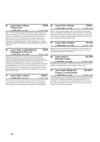 1415 Leica I Mod. A Elmar %u20ac700%u2018Close Focus%u2019no. 20018, 1929, condition B+ %u20ac 1.400 %u2013 1.600Nice 7th version (see von Einem %u2018Die 10 Varianten der klassischen Leica I A mit Elmar 1:3.5 F=50 mm%u2019) in good condition, delivered to London%u00a0on 06.06.1929, with close-focus Elmar 1:3.5 F=50%u2009mm infeet, focus until 1.5\polished), base plate engraved with %u2018open-close%u2019, with 2%u2009%u00d7 filmmagazines in cardboard canister, FODIS rangefinder no.%u200913488 infeet scale, together in ETRIN leather case stamped with both Leitz and Leica.16 Leica I Mod. A with Radionar %u20ac900Anastigmat 6.3/10.5 cmno. 37044, 1930, condition B/A %u20ac 1.800 %u2013 2.000Interesting Leica I%u00a0Mod. A 7th version (see von Einem %u2018Die 10 Varianten der klassischen Leica I A mit Elmar 1:3.5 F=50 mm%u2019) in very good condition, originally fitted%u00a0with an Elmar 3.5/50%u2009mm anddelivered to retailer W%u00fcnsche, Frankfurt, on 17.04.1930, hereprofessionally modified%u00a0(not by Leica) w ith fixed tele-lens SchneiderAnastigmat Radionar 6.3/10.5%u2009cm no.%u2009136994 (1926), this type oflens%u00a0comes from a 6%u2009%u00d7%u20099 folding cameras, mounted at the end of anickel plated lens barrel scaled in%u00a0meter, together with Leica blackpaint front lens cap.17 Leica I Mod. A Elmar %u20ac800*no. 45279, 1930, condition B%u2013 %u20ac 1.600 %u2013 1.80010th%u00a0version in meter scale (see von Einem %u2018Die 10 Varianten derklassischen Leica I A mit Elmar 1:3.5 F=50 mm%u2019) in used condition with an attractive patina,%u00a0delivered to%u00a0Leitz Berlin on 29.08.1930.18 Leica I Mod. A Elmar %u20ac500*no. 22777, 1930, condition B+ %u20ac 1.000 %u2013 1.200Nice 6th version (see von Einem %u2018Die 10 Varianten der klassischen Leica I A mit Elmar 1:3.5 F=50%u2009mm%u2019) in good%u00a0condition, meter scale,delivered on 23.07.1930 to Prague, optics showing some cleaning marks and a few flakes, some hand engravings can be seen on thefocus scale and in the black paint finish.19 Leica I Mod. A Hektor %u20ac1.200no. 49330, 1930, condition A/B %u20ac 2.400 %u2013 2.600Beautiful rare Leica I Mod. A with fast Hektor 2.5/50%u2009mm lens, only1,330 produced, in almost mint and original condition, with front cap, delivered to%u00a0Berlin on 15.10.1930.20 Leica I Mod. B %u20ac5.000Dial-Set Compurno. 6110, 1928, condition B/A %u20ac 10.000 %u2013 12.000Rare first model with Elmar 3.5/50%u2009mm mounted in dial-set Compurshutter, in very good and original condition,%u00a0meter scale.21 Leica I Mod. B Ring-Set %u20ac4.000*Compur %u2018Lutz Ferrando%u2019 no. 34733, 1930, condition B %u20ac 7.000 %u2013 8.000An interesting Compur-Leica, delivered on 25 July 1930 to Ferrando,Montevideo, and bearing a special matching engraving on the viewfinder: %u2018Lutz, Ferrando y Cie, Buenos Aires.%u2019 The camera is infine, original condition; this is the first time we have encountered aCompur-Leica with this engraving.