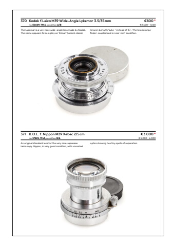 370 Kodak f.Leica M39 Wide-Angle Lykemar 3.5/35 mm %u20ac800*no. E0609, 1946, condition A/B %u20ac 1.400 %u2013 1.600The Lykemar is a very rare wide-angle lens made by Kodak. The name appears to be a play on %u2018Elmar%u2019 (Leica%u2019s classic lenses), but with %u2018Lyke-%u2019 instead of %u2018El-,%u2019 the lens is rangefinder-coupled and in near-mint condition.371 K.O.L. f. Nippon M39 Xebec 2/5 cm %u20ac3.000*no. 57825, 1943, condition B/A %u20ac 5.000 %u2013 6.000An original standard lens for the very rare JapaneseLeica copy Nippon, in very good condition, with uncoated optics showing two tiny spots of separation.