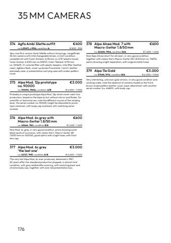 176374 Agfa Ambi Silette outfit %u20ac400no. LZ3417, c.1956, condition A%u2013 %u20ac 800 %u2013 900Very nice first version Ambi Sillette without strap lugs, rangefinder35 mm camera with interchangeable lenses, in mint condition, complete set with Color-Ambion 4/35%u2009mm no.%u20095131 (plastic hood),Color-Solinar 2.8/50%u2009mm no.S98131, Color-Telinear 4/90%u2009mmno.%u2009005619, 3%u2009%u00d7 colored filter with plastic keepers, UVa filter (leathercase), Agfalux flash, close-up lenses Proximeter I and II, leathereveready case, in presentation carrying case with snake-patterncover.375 Alpa Mod. 12p prototype %u20ac3.000no. 90000no. 90000, 1960s, condition A/B %u20ac 6.000 %u2013 7.000Probably a unique prototype Alpa Mod. 12p which never went into production, based on the Alpa 6c%u00a0but without mirror and finder, forscientific or technical use, note%u00a0the different course of the windinglever, the serial number no. 90000 (might be allocated to prototype cameras), with body cap and back with matching serial number.376 Alpa Mod. 6c grey with %u20ac600Macro-Switar 1.8/50 mmno. 43666, 1961, condition B/A %u20ac 1.200 %u2013 1.400Nice%u00a0Mod. 6c grey, in very good condition, prism showing someblack spots of corrosion, with classic Kern-Macro-Switar AR 1.8/50%u2009mm no.%u2009922342, good optics with a light haze, with frontlens cap.377 Alpa Mod. 6c grey %u20ac3.000%u2018the last one%u2019no. 62127, 1987, condition A/B %u20ac 6.000 %u2013 7.000The very last Alpa Mod. 6c ever produced, delivered in 1987,20 years after the standard production stopped, in almost mint condition, with grey leatherette covering, with matching back andchrome body cap, together with rare red presentation box.378 Alpa Alnea Mod. 7 with %u20ac600Macro-Switar 1.8/50 mmno. 32400, 1954, condition B/A %u20ac 1.200 %u2013 1.400Nice Alpa Alnea (short for all near), in very good condition, together with classic Kern-Macro-Switar AR 1.8/50%u2009mm no.%u2009748114,optics showing a light separation, with original metal hood.35 MM CAMERAS379 Alpa 11e Gold %u20ac3.000no. 57545, 1972, condition B/A %u20ac 6.000 %u2013 7.000Very interesting, unknown gold version, in very good condition and working order,%u00a0note the absence of camera model on the front,brown snake pattern leather cover, back attachment with anotherserial number (no. 44829), with body cap.