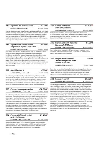 178385 Canon 7 chrome %u20ac1.200*with 0.95/50 mm no. 914665, c.1962, condition A%u2013 %u20ac 2.400 %u2013 2.800Body in mint condition, with sought-after ultra-fast Canon 0.95/50%u2009mm no.%u200911886,%u00a0optics showing a few cleaning marks, withoriginal protection filter, leather case and rareoutfitmaker%u2019sbox with matching serial numbers.386 Gamma III with Koristka %u20ac1.000Gamma 3.5/55 mmno.10204, c.1947, condition A/B %u20ac 2.000 %u2013 2.400Rare Italian%u00a0Leica copy with M39 screw mount, in almost mintcondition, with rare Koristka Victor 3.5/55%u2009mm no.%u200975468, goodoptics, with original front lens cap.387 Ihagee Kine Exakta I %u20ac500%u2018Round Magnifier%u2019 with Tessar 2.8/5 cmno. 485110, 1936, condition B %u20ac 1.000 %u2013 1.200Rare first version Kine Exakta SLR with round magnifier in the nonremovable viewing hood, in good used%u00a0condition, with matchingTessar 2.8/5%u2009cm no.%u20092000761 in%u00a0heavy brass mount, very goodoptics only showing a light cleaning mark, with Czech brochure.388 Konica F outfit %u20ac1.400*no.100352, 1960, condition A%u2013 %u20ac 2.800 %u2013 3.200An extremely rare Konica F, introduced in 1960 as the company%u2019s very first 35%u2009mm single-lens reflex camera and one of the earliestJapanese SLRs with an instant-return mirror. The Konica F was produced only in very limited numbers (fewer than 1,600 units are believed to have been made) before being quickly replaced by the more advanced FS model, making it one of the hardest Konica cameras to find today. The camera features a robust die-castbody, a newly developed bayonet mount, and advanced shutterspeeds up to 1/2000 s%u2009%u2014%u2009a remarkable achievement at the time.Offered here in beautiful, near-mint condition with well-preservedmechanics, including the standard Hexanon 1.4/52%u2009mm no.%u20094120879,Hexanon 2.8/100%u2009mm no.%u20095222353,%u00a0a Hexanon 3.5/135%u2009mmno.%u20095670567 and a leather case. It%u00a0is an excellent example of alandmark model in the history of Japanese SLR development, and an important piece for any serious collector of early post-war cameras.382 Asahi Pentar K %u20ac800*no.168041, 1958, condition A/B %u20ac 1.600 %u2013 2.000An extremely rare Pentar K, produced for only a brief period in 1958 specifically for the South African market. Very few of thesecameras were made, and surviving examples are seldom encountered. The offered camera is in near-mint condition and comesfitted with a Takumar 58%u2009mm f/2.4 no.%u2009146796. A highly desirablerarity for advanced collectors of early Asahi Pentax cameras.381 Alpa Reflex Series E with %u20ac4.500Ang%u00e9nieux Alpar 2.9/50 mmno. 20011, 1947, condition A%u2013 %u20ac 9.000 %u2013 10.000One of the first Series E model (starting with no.%u200920000), in mintcondition, with rare matching collapsible Ang%u00e9nieux Alpar 2.9/50%u2009mm no.%u200960487 in original Alpa mount (ca. only 3500 unitsproduced),%u00a0very good optics with early original coating onlyshowing a few light cleaning marks, front lens cap, with rare French paper cover showing the operation, French instructions, import certificate delivered from French retailer Sarine, customs lead seal,rare Alpa shutter release cable, leather case and maker%u2019s box, avery niceoutfit!383 Canon Hansa pre-series %u20ac4.000*no. 90/1090, 1935, condition B/A %u20ac 8.000 %u2013 10.000An extremely early Canon Hansa from the very first small production batch, still retaining several features of the legendary Kwanon prototypes%u2009%u2014%u2009such as the detent near the pop-up viewfinder, thedistinctive shutter release, and the base plate with blind cap(originally intended for the rewind knob on the Kwanon camera). The lens mount bears the number 90, making it one of the earliest recorded examples, while the base plate is engraved 1090 (Peter Dechert notes 1119 as the lowest previously known number!).The camera is preserved in excellent condition and is offered withits matching early black-face Nikkor 3.5/50%u2009mm lens.384 Canon VI-T black paint %u20ac1.400*with 1.2/50 mm no. 617208, c.1959, condition A/B %u20ac 2.800 %u2013 3.000Uncommon black paint VI-T in beautiful, almost mint condition, shutter curtains with some dents but still fully operable, with rarematching all-black M39 Canon 1.2/50%u2009mm no.%u200921799, very goodoptics only showing a light scratch on the front element.380 Alpa 11el AV Master Gold %u20ac2.000no. 61909, 1989, condition A%u2013 %u20ac 4.000 %u2013 5.000Most probably a unique Alpa 11el AV in gold painted finish with blackleather covering, in original, mint condition, note the Master system connection, an Alpa document (copy included) shows this camera was fully assembled on 15.03.1989 and delivered on 02.05.1989, made by special order or as a presentation camera, with body cap and very rare red presentation box.