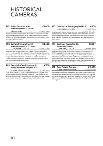 184407 Balda Piccochic with %u20ac1.000Makro Plasmat 2.7/5 cm1931, condition B+ %u20ac 2.000 %u2013 2.400Nice strut-folding camera for 16 exposures 3%u2009%u00d7%u20094%u2009cm on 127 roll film,very rare version with sought-after Meyer G%u00f6rlitz Makro-Plasmat 2.7/5%u2009cm no.%u2009504498 mounted in Compur shutter, with leather frontlens cap and leather case.408 Bentzin Primarette with %u20ac3.600Makro Plasmat 2.7/7.5 cmno. 490, 1931-33, condition B+ %u20ac 7.000 %u2013 8.000Rare twin-lens folding camera (not a reflex camera!) for 8 exposures 4%u2009%u00d7%u20096.5%u2009cm on 127 film, separate bellows for taking and viewinglens, early version with front shutter release, in good condition, withsought-after Makro Plasmat 2.7/7.5%u2009cm no.%u2009581504 mounted inCompur shutter, good optics, note the automatic parallax correction, with rare original leather case.HISTORICALCAMERAS409 Bentzin Reflex-Primar with %u20ac700Meyer Goerlitz Trioplan 3/7\no. 23420, 1920s, condition B/A %u20ac 1.400 %u2013 1.600Quite early SLR for 9%u2009%u00d7%u200912%u2009cm, focal plane shutter to 1/100sec, withunusual Meyer-Goerlitz %u2018Ani-Size%u2019 Trioplan 3/7\good condition, shutter needs attention, with front lens cap, originalhood, leather strap, film magazine holder and leather case.410 Dubroni Le St%u00e9r%u00e9ographe No. 2 %u20ac800no. 410, 1880s, condition B/A %u20ac 1.600 %u2013 1.800Very rare%u00a0early walnut folding side strut camera for 10.5%u2009%u00d7%u200915%u2009cm filmplates with wool%u00a0bellows, with unnamed brass sliding lens with 2%u2009%u00d7Waterhouse apertures and front lens cap, in very good condition, some cracks in the wood, with focusing back and one double filmplate holder.411 Eastman Kodak Co. 3A %u20ac500*Panoram-Kodak no.1373, c.1899, condition A%u2013 %u20ac 1.000 %u2013 1.200An exceptional Kodak 3A Panoram camera, introduced around 1899. Equipped with the ingenious swinging-lens mechanism, it produces striking panoramic images on 2%u00bc%u00d76%u00bc%u2019 (6%u2009%u00d7%u200915%u2009cm) film. Theoffered example is preserved in outstanding, beautiful condition,with a clean body, functional shutter, and excellent optics. Rarelyfound so well preserved, it represents one of the finest examples ofthis classic panoramic Kodak we have encountered.412 Eder Patent Camera %u20ac2.000no.1006, c.1933, condition B/A %u20ac 4.000 %u2013 5.000Very rare horizontal non-reflex twin-lens camera, small version for4.5%u2009%u00d7%u20096%u2009cm pictures on roll film, in very good condition, note the rackand pinion focusing with automatic parallax correction, with Tessar 4.5/7.5%u2009cm no.%u20091359680 taking lens and Sucher-Anastigmat f:4.5viewing lens.