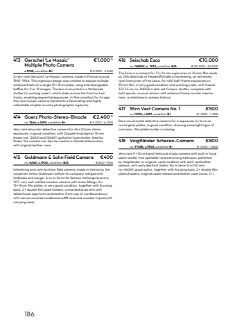 186415 Goldmann & Sohn Field Camera %u20ac400no. 4242, c.1900, condition B/A %u20ac 800 %u2013 900Interesting and rare Austrian field camera, made in Vienna by thecarpenter Anton Goldmann before his%u00a0company merged withHrdliczka and Langer & co to form the famous Herlango brand in 1917, very well crafted wooden camera with brass fittings, for13%u2009%u00d7%u200918%u2009cm film plates, in very good condition, together with focusingback, 2%u2009%u00d7 double film plate holders, unmarked brass lens withWaterhouse apertures and leather front cap (in cardboard box), with canvas covered cardboardoutfitcase and wooden tripod (withcarrying case).416 Seischab Esco %u20ac10.000no.168552, c. 1922, condition B/A %u20ac 20.000 %u2013 24.000The Esco is a camera for 17%u2009%u00d7%u200924%u2009mm exposures on 35%u2009mm film madeby Otto Seischab of Heideloffstra%u00dfe in Nurenberg, an extremelyrare forerunner of the Leica, for 400 half-frame exposures on 35%u2009mm film, in very good condition and working order, with Cassar3.5/3.5%u2009cm no.%u2009168552 in dial-set Compur shutter, complete withboth spools, unusual version with external frame counter mechanism, a milestone in camera history!417 Stirn Vest Camera No.1 %u20ac500no.12110, c.1891, condition B+ %u20ac 1.000 %u2013 1.200Rare round metal detective camera for 6 exposures 4 %u00d7 4 cm on round glass plates, in good%u00a0condition, showing some light signs ofcorrosion, film plates holder%u00a0is missing.418 Voigtl%u00e4nder Scheren-Camera %u20ac800no. 97385, c.1903, condition B%u2013 %u20ac 1.600 %u2013 1.800Very rare 9 %u00d7 12 cm hand-held and studio camera with built-in focal plane shutter (not operable) and extra long extension, patentedby Voigtl%u00e4nder, in original, used condition with dark red leather bellows,%u00a0with early Berthiot Stellor No.%u20094 Serie 1b 4/150%u2009mmno.%u200946069, good optics, together with focusing back, 2%u2009%u00d7 double filmplates holders, original cable release and leather case (cond. C-).413 Gerschel %u2018Le Mosaic%u2019 %u20ac1.000*Multiple Photo Camera c.1905, condition B+ %u20ac 2.000 %u2013 2.400A very rare Gerschel %u2018Le Mosaic%u2019 camera, made in France around 1905%u20131906. This ingenious design was created to expose multiple small portraits on a single 13 %u00d7 18 cm plate, using interchangeable baffles for 9 or 12 images. The lens is mounted in a Wollensakshutter (in working order), which slides across the front on twintracks, enabling sequential exposures. In fine condition for its age,this rare mosaic camera represents a fascinating and highly collectable%u00a0chapter in early photographic ingenuity.414 Goerz Photo-Stereo-Binocle %u20ac2.400*no.1566, c.1899, condition B+ %u20ac 5.000 %u2013 6.000Very rare binocular detective camera for 45 %u00d7 50 mm stereo exposures, in good condition, with Doppel-Anastigmat 75 mm lenses nos.%u2009126361 and 126427, guillotine-type shutter, Newtonfinder, the camera can also be used as a standard%u00a0binoculars,with original leather case.