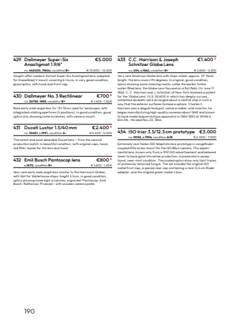 190429 Dallmeyer Super-Six %u20ac5.000Anastigmat 1.9/6\no. 442200, 1960s, condition B+ %u20ac 10.000 %u2013 12.000Sought-after medium format Super-Six Anastigmat lens, adapted for Hasselblad V mount, covering 6 %u00d7 6 cm, in very good condition, good optics, with hood and front cap.430 Dallmeyer No. 3 Rectilinear %u20ac700*no. 36750, 1885, condition B+ %u20ac 1.400 %u2013 1.600Rare early wide angle lens for 13 %u00d7 18 cm used for landscape, with integrated rotating apertures (5 positions), in good condition, good optics only showing some scratches, with camera mount.431 Ducati Luxtor 1.5/40 mm %u20ac2.400*no. 34451, c.1951, condition A%u2013 %u20ac 4.500 %u2013 5.000The rarest and most desirable Ducati lens %u2014 from the second production batch. In beautiful condition, with original caps, hood, red filter, boxes for the lens and hood.432 Emil Busch Pantoscop lens %u20ac800*c.1870, condition B+ %u20ac 1.600 %u2013 1.800Very rare early wide angle lens (similar to the Harrison%u2019s Globe), with Slot for Waterhouse stops, height 3.5%u2009cm,%u00a0in good condition,optics showing some light scratches, engraved %u2018Pantoscop. Emil Busch. Rathenow. Pruessen.%u2019 with wooden camera plate.433 C.C. Harrison & Joseph %u20ac1.400*Schnitzer Globe Lens no. 234, c.1862, condition B+ %u20ac 2.800 %u2013 3.200Very rare American Globe lens with stops wheel, approx. 10\length, the lens covers 90 degrees. In original, good condition, optics showing some cleaning marks, unlike the earlier Suttonwater-filled lens, the Globe Lens focused on a flat field. On June 17,1862, C. C. Harrison and J. Schnitzer of New York received a patent for the %u2018Globe Lens%u2019 (U.S. 35.605) in which two deeply-curved, cemented doublets were arranged about a central stop in such a way that the exterior surfaces formed a sphere. Charles C. Harrison was a daguerreotypist, camera maker, and inventor,%u00a0hebegan manufacturing high-quality cameras about 1849%u00a0and%u00a0knownto have made daguerreotype apparatus in 1854-1855 at White & Elm Sts.. He died Nov.23, 1864.434 ISO Iriar 3.5/12.5 cm prototype %u20ac3.000no.0052, c.1954, condition A/B %u20ac 6.000 %u2013 7.000Extremely rare Italian ISO telephoto lens prototype in rangefindercoupled M36 screw mount for the ISO Bilux camera. This experimental lens, known only from a 1951 ISO advertisement and believed never to have gone into series production, is preserved in exceptional, near-mint condition. The coated optics show only faint traces of previously removed fungus. The set includes the original ISO metal front cap, a special rear cap containing a rare 12.5%u2009cm finderadapter, and the original green maker%u2019s box.