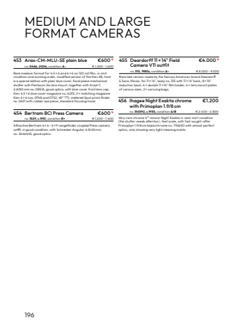 196454 Bertram BCI Press Camera %u20ac600*no.1529, c.1951, condition B+ %u20ac 1.200 %u2013 1.400Attractive Bertram 6%u2009%u00d7%u20096%u2009%u2013%u20096%u2009%u00d7%u20099 rangefinder coupled Press cameraoutfit, in good condition, with Schneider Angulon 6.8/65%u2009mmno. 3646445, good optics.455 Deardorff 11 %u00d7 14\%u20ac4.000*Camera V11 outfit no. 315, 1980s, condition A%u2013 %u20ac 8.000 %u2013 9.000Rare late version made by the famous American brand Deardorff& Sons, Illinois, for 11 %u00d7 14\reduction back, 4%u2009%u00d7 double 11%u2009%u00d7%u200914\of various sizes, 2 %u00d7 carrying bags.456 Ihagee Night Exakta chrome %u20ac1.200with Primoplan 1.9/8 cmno. 516592, c.1935, condition A/B %u20ac 2.400 %u2013 2.800Very rare chrome 4th version Night Exakta in near mint condition (the shutter needs attention), feet scale, with fast sought-afterPrimoplan 1.9/8%u2009cm black/chrome no.%u2009792630 with almost perfectoptics, only showing very light cleaning marks.MEDIUM AND LARGE FORMAT CAMERAS453 Arax-CM-MLU-SE plain blue %u20ac600*no.0466, 2004, condition A%u2013 %u20ac 1.200 %u2013 1.600Rare medium format for 4.5%u2009%u00d7%u20096 and 6%u2009%u00d7%u20096 on 120 roll film, in mintcondition and working order, modified version of the Kiev 88, hereis a special edition with plain blue cover, focal plane mechanical shutter with Pentacon Six lens mount, together with Arsat C2.8/80%u2009mm no.%u200908516, good optics, with blue cover front lens cap,Kiev 4.5 %u00d7 6 blue cover magazine no. 6235, 2 %u00d7 matching magazine Kiev 6%u2009%u00d7%u20096 nos.%u20090748 and 0752, 45%u00b0 TTL metered Spot prism finderno.0631 with rubber eye piece, standard focusing hood.