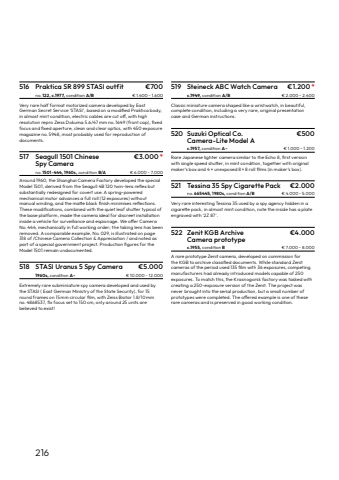 216517 Seagull 1501 Chinese %u20ac3.000*Spy Camera no.1501-444, 1960s, condition B/A %u20ac 6.000 %u2013 7.000Around 1960, the Shanghai Camera Factory developed the special Model 1501, derived from the Seagull 4B 120 twin-lens reflex butsubstantially redesigned for covert use. A spring-powered mechanical motor advances a full roll (12 exposures) without manual winding, and the matte black finish minimises reflections.These modifications, combined with the quiet leaf shutter typical ofthe base platform, made the camera ideal for discreet installation inside a vehicle for surveillance and espionage. We offer CameraNo.%u2009444, mechanically in full working order; the taking lens has beenremoved. A comparable example, No.029, is illustrated on page 318 of /Chinese Camera Collection & Appreciation / and noted aspart of a special government project. Production figures for theModel 1501 remain undocumented.518 STASI Uranus 5 Spy Camera %u20ac5.0001960s, condition A%u2013 %u20ac 10.000 %u2013 12.000Extremely rare subminiature spy camera developed and used by the STASI ( East German Ministry of the State Security), for 15 round frames%u00a0on 15%u2009mm circular film, with Zeiss Biotar 1.8/10%u2009mmno.%u20094868537, fix focus set to 150%u2009cm, only around 25 units arebelieved to exist!519 Steineck ABC Watch Camera %u20ac1.200*c.1949, condition A/B %u20ac 2.000 %u2013 2.400Classic miniature camera shaped like a wristwatch, in beautiful, complete condition, including a very rare, original presentation case and German instructions.520 Suzuki Optical Co. %u20ac500Camera-Lite Model Ac.1957, condition A%u2013 %u20ac 1.000 %u2013 1.200Rare%u00a0Japanese lighter camera similar to the Echo 8, first versionwith single speed shutter, in mint condition,%u00a0together with originalmaker%u2019s box and 4%u2009%u00d7 unexposed 8%u2009%u00d7%u20098 roll films (in maker%u2019s box).521 Tessina 35 Spy Cigarette Pack %u20ac2.000no. 665445, 1980s, condition A/B %u20ac 4.000 %u2013 5.000Very rare interesting Tessina 35 used by a spy agency hidden in a cigarette pack, in almost mint condition, note the inside has a plateengraved with %u20182Z 87%u2019.522 Zenit KGB Archive %u20ac4.000Camera prototypec.1955, condition B %u20ac 7.000 %u2013 8.000A rare prototype Zenit camera, developed on commission forthe KGB to archive classified documents. While standard Zenitcameras of the period used 135 film with 36 exposures, competingmanufacturers had already introduced models capable of 250 exposures. To match this, the Krasnogorsk factory was tasked with creating a 250-exposure version of the Zenit. The project was never brought into the serial production, but a small number of prototypes were completed. The offered example is one of theserare cameras and is preserved in good working condition.516 Praktica SR 899 STASI outfit %u20ac700no.122, c.1977, condition A/B %u20ac 1.400 %u2013 1.600Very rare half format motorized camera developed by East German Secret Service %u2018STASI%u2019, based on a modified Praktica body,in almost mint condition, electric cables are cut off, with highresolution repro Zeiss Dokuma 5.6/47%u2009mm no.%u20091649 (front cap), fixedfocus and fixed aperture, clean and clear optics, with 450 exposuremagazine no. 5948, most probably used for reproduction of documents.