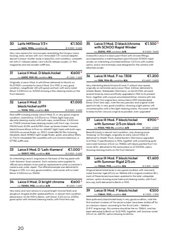 2031 Leica II Mod. D black/nickel %u20ac600*no. 22339, 1929-33, condition B/A %u20ac 1.200 %u2013 1.400Originally a Leica I Mod. A with Elmar%u00a0delivered to Munich on16.07.1929, converted to Leica II Mod. D in 1933,%u00a0in very goodcondition, rangefinder still with good contrast,%u00a0with early%u00a0nickelElmar 3.5/50%u2009mm no.%u2009147053 showing a few cleaning marks on thefront element.32 Leica II Mod. D %u20ac1.000black/nickel outfitno. 75538, 1932, condition B/A %u20ac 2.000 %u2013 2.400Niceoutfitincluding a body Leica%u00a0II Mod. D, in very good, originalcondition, nickel Elmar 3.5/35%u2009mm no.%u2009171464 (light haze anddiscrete cleaning marks) with both caps, nickel Elmar 3.5/50%u2009mmno.170215 (minimal haze cleaning marks) with front cap, chrome FISON hood,%u00a0ELPIK%u00a0and%u00a0ELPRO close-up lenses (maker%u2019s boxes),black/chrome Elmar 4/9%u2009cm no.%u2009454407%u00a0(light haze) with both caps,VIDOOH universal finder no.%u200933157, nickel ABLON film trimmingtemplate, black WINKO right-angle finder, green and yellow filters,2%u2009%u00d7 FILCA reloadable film cassettes%u00a0with one chrome metal box, inETTREoutfitcase.33 Leica II Mod. D %u2018Leih-Kamera%u2019 %u20ac1.000*no.100577, 1933, condition B/A %u20ac 2.000 %u2013 2.400An interesting Leica II, engraved on the back of the top plate with %u2018Leih-Kamera%u2019 (loan camera). Such cameras were supplied to official Leica dealers to be used as replacements while a customer%u2019scamera was under repair. The offered example was delivered toPrague in 1931, is in very good condition, and comes with a nickel Elmar 3.5/50%u2009mm no.%u2009155041.34 Leica II Mod. D bright chrome %u20ac600*no.112050, 1933, condition A/B %u20ac 1.200 %u2013 1.400Very early and rare version in unusual bright chrome finish anddoughnut-shaped shutter speed platform, in almost mint condition,delivered on 01.06.1933 to Berlin,%u00a0with Elmar%u00a03.5/5%u2009cm no.%u2009233514,good optics with minimal cleaning marks, with front lens cap.35 Leica II Mod. D black/chrome %u20ac1.500*with SCNOO Rapid Winder no. 252132, 1937, condition A/B %u20ac 3.000 %u2013 3400A beautiful Leica II in black paint finish with chrome fittings,accompanied by a matching black paint/chrome SCNOO rapidwinder, an interesting unnumbered Elmar 3.5/5%u2009cm with coatedoptics, and a rare eveready case designed for the camera with attached winder.36 Leica III Mod. F no.1308 %u20ac1.200no.1308, 1926-55, condition B/A %u20ac 2.400 %u2013 2.800Very interesting black/chrome III mod. F without slow speed,originally an extremely early Leica I Mod. A Elmar delivered to retailer Besier, Wiesbaden (Germany), on 26.04.1926, serviced several times by Leica and finally upgraded in 1956 to its presentform, together with unusual%u00a0unnumbered Elmar chrome with redscale, in fact the original lens remounted in M39 standardized Elmar (front lens cap), note the very peculiar and original nickel aperture%u00a0tab, in very good condition, showing a light patina, stilluncoated optics with a few light cleaning marks, the owner wanted to keep his/her%u00a0Leica as original as possible, even upgraded!30 Leitz Mifilmca 1/3 %u00d7 %u20ac1.500no. 4626, 1930s, condition A%u2013 %u20ac 3.000 %u2013 3.400Very rare camera for microscopes resembling the Compur-Leica housing, early version with non-removable%u00a01/3%u2009%u00d7 conical adapter,dial set Compur-shutter, body in beautiful, mint condition, completeset with 2%u2009%u00d7 release cables, rare CALOS release coupler, 2%u2009%u00d7 filmmagazines and red woodenoutfitbox.37 Leica III Mod. F black/nickel %u20ac900*with Summar 2/5 cm black rim no. 91320, 1932-34, condition A/B %u20ac 1.800 %u2013 2.000Beautiful body%u00a0in almost mint condition, only showing some%u2018brassing%u2019 on the edges, originally an early Leica II Mod. D. delivered to retailer Flock, Kaiserslautern (Germany) upgradedto III Mod. F%u00a0specifications in 1934, together with a matching quiterare nickel%u00a0Summar 2/5%u2009cm no.%u2009194856 with black painted front rim(cond. B/A), delivered to the same place on 27.03.1934, opticsshowing cleaning marks on the front element.38 Leica III Mod. F black/nickel %u20ac1.600with Summar Rigid 2/5 cmno.110463, 1933, condition B/A %u20ac 3.200 %u2013 3.600Original black/nickel body%u00a0in very good condition with rare earlynickel Summar rigid 2/5%u2009cm no.%u2009186446 still in original condition (B+),most of these lenses have been updated to the later collapsible version,%u00a0optics showing some haze and cleaning marks, with frontlens cap, both delivered to Berlin in 1933.39 Leica III Mod. F black/nickel %u20ac500no.11284X, 1933, condition B/A %u20ac 1.000 %u2013 1.200Nice quite early black/nickel body in very good condition, note thefirst and last numbers of the serial number have been drilled off foran unknown reason, according to the %u2018Ernst Leitz %u2014Wetzlar %u2014D.R.P%u2019 engravings, this camera should be the no.11284X, and has been delivered to Berlin on 16.12.1933, together with Summar nickel 2/5%u2009cm no.%u2009228732, optics showing%u00a0scratches.