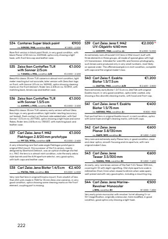 222534 Contarex Super black paint %u20ac900no. G39250, 1968, condition B/A %u20ac 1.800 %u2013 2.000Rare first version%u00a0in black paint finish, in very good condition, withblack Planar 2/50%u2009mm no.%u20094501068, optics only showing a lighthaze, with front lens cap and leather case.535 Zeiss Ikon Contaflex TLR %u20ac1.000with Sonnar 2/5 cmno.Y.84856, c.1936, condition A/B %u20ac 2.000 %u2013 2.400Beautiful classic 35 mm TLR camera in almost mint condition, light meter reacting but not accurate,%u00a0later version with Zeiss Ikon logoon front, with Sonnar 2/5%u2009cm no.%u20091659412, optics showing cleaningmarks on the front element, finder%u00a0lens 2.8/8%u2009cm no.%u20091513901, withmatching back, lenses cap and leather case.536 Zeiss Ikon Contaflex TLR %u20ac1.000with Sonnar 1.5/5 cmno. A49890, c.1935, condition B/A %u20ac 2.000 %u2013 2.400Beautiful classic 35 mm TLR camera, early version without Zeiss Ikon logo, in very good condition, light meter reacting (accuracy not tested), flash contact on the back side added later, with fastSonnar 1.5/5%u2009cm no.%u20092077055, optics showing a light haze and someflakes, finder%u00a0lens 2.8/8%u2009cm no.%u20091781037, with matching back andleather case.537 Carl Zeiss Jena f. M42 %u20ac1.000Flektogon 2.8/20 mm prototypeno. 991 123, 1970s, condition A/B %u20ac 2.000 %u2013 2.400A%u00a0very interesting rare fast wide angle Flektogon prototype inoriginal M42 mount, this successor of the f:4 version, mainly designed by Eberhard Dietzsch, was an optical challenge startedin c.1967, the lens is in almost mint condition, note the early zebra style barrels%u00a0and the A/M aperture selector, very good optics,with both caps and leather case.538 Carl Zeiss Jena Biotar 1.4/5 cm %u20ac2.400no. 916724, 1928, condition B/A %u20ac 5.000 %u2013 6.000Very rare fast lens%u00a0in original Kinamo mount, from a batch of lessthan 250 units made in 1928 for 35 mm Zeiss cine cameras, in very good condition, optics showing some cleaning marks on the front element, coupling part is missing.539 Carl Zeiss Jena f. M42 %u20ac2.000*UV-Objektiv 4/60 mm no. 6030991, 1960, condition A%u2013 %u20ac 4.000 %u2013 5.000An extremely rare ultraviolet (UV) lens in M42 mount, built with three elements in three groups, all made of special glass with high UV transmission. Intended for scientific and forensic photography,such lenses were produced only in very small numbers, most likely on special order. The offered example is in mint condition, completewith caps and the original maker%u2019s box.540 Carl Zeiss f. Exakta %u20ac1.200Biotar 1.5/7.5 cmno. 2667126, 1940, condition A/B %u20ac 2.400 %u2013 2.800Rare extremely early Biotar 1.5/7.5%u2009cm no.%u20092667126 with originalExakta mount, in very good condition, optics later coated, only showing a few discrete cleaning marks, with hood and front cap.541 Carl Zeiss Jena f. Exakta %u20ac400Biotar 1.5/75 mmno. 4831082, 1956, condition A%u2013 %u20ac 800 %u2013 900Fast portrait lens in original Exakta%u00a0mount, in mint%u00a0condition, opticswith some haze and light cleaning marks, with both caps.542 Carl Zeiss Jena %u20ac600Planar 3.8/130 mmno. 34819, 1899, condition B+ %u20ac 1.200 %u2013 1.400Very rare and extremely early Planar lens, in good condition, clean and clear optics, smooth focusing and iris aperture, with rare original maker%u2019s box.543 Carl Zeiss Jena %u20ac600Tessar 3.5/300 mmno.102084, 1908, condition B+ %u20ac 1.200 %u2013 1.400An early, very rare brass version of the fast f:3.5 Tessar 300 mm, covering 8%u2009%u00d7%u200910 with slight vignetting. Old-style aperture scale inmillimetres (from 3 mm when closed to 68 mm when wide open), well-preserved with very good optics, including a mounting ring.544 Carl Zeiss Jena Marine- %u20ac500Revolver Monocularc.1896, condition B+ %u20ac 1.000 %u2013 1.200Very early prism monocular with revolver turret allowing%u00a05%u2009%u00d7 or10%u2009%u00d7 magnification, originally a binocular, here modified, in goodcondition, good optics only showing a light haze.