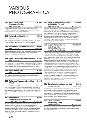 224547 Alpa Reflex Presentation Stand %u20ac4001950s, condition A%u2013 %u20ac 800 %u2013 900Beautiful advertising stand for Alpa Reflex camera, French version,18 %u00d7 20cm printed embossed metal in 2 parts, in almost new condition, with original cardboard box.548 Agfa Advertising Camera Stand %u20ac3001960s, condition B+ %u20ac 600 %u2013 700Very nice%u00a0camera stand in the shape of 2 stylised characters holdingan Agfa Silette-L camera, 16.5%u2009%u00d7%u200925%u2009cm painted metal structure andplastic head, in good condition despite some signs of corrosion.549 Agfa Dealer Sign %u20ac3001960s, condition B/A %u20ac 600 %u2013 700Very nice authorized Agfa dealer sign, in very good condition, 33 %u00d7 50cm molded and painted metal.550 Rolleicord Wooden Advertising %u20ac400Stand c.1935, condition B/A %u20ac 800 %u2013 900Rare interesting advertising for Rolleicord, ca. 28 %u00d7 26 cm painted wooden stand in round shape, in very good condition, repainted base, stamped %u2018made in Germany%u2019 on the back, together with early Rolleicord no.058137 (condition B+) with leather strap and lenses cap.551 Path%u00e9 Fr%u00e8res %u20ac600Cinematographic projectorno.1336, c.1903, condition B/C %u20ac 1.200 %u2013 1.400An early hand-cranked cinematographic projector, made only a few years after the invention of the Cin%u00e9matographe by the Lumi%u00e8re brothers. Path%u00e9 Fr%u00e8res quickly established itself as one ofthe leading companies in this new industry. The offered exampleis in very good condition, though some parts are missing. An attractive display piece and an important milestone in the historyof cinematography.546 Agfa Advertising Mirror %u20ac3001980s, condition A%u2013 %u20ac 600 %u2013 700Very nice German advertising mirror in the shape of a film spool,in mint condition, 52.5 %u00d7 32 cm printed plastic and glass.545 Agfa Advertising %u20ac300Oversized Film Box1960s, condition B/A %u20ac 600 %u2013 700Classic dealer advertising sign for Agfa, oversized film box,73 %u00d7 24 cm printed metal in very good condition, only some light signs of corrosion%u00a0on the edges, with 2 hooks.VARIOUS PHOTOGRAPHICA553 Urban Motion Picture %u20ac10.000*Industries, NY, Spirograph projector no.000027, 1922, condition A/B %u20ac 20.000 %u2013 24.000The first motion picture disc player, the Spirograph, was patentedin 1907 by U.K. inventor Theodore Brown (1870%u20131938), although it was never produced commercially during his lifetime. Only after Brown sold the rights to U.S. motion picture pioneer Charles Urban (1867%u20131942) did marketing and production begin. Urban was already promoting the Spirograph as early as 1915, and in 1921 he founded Urban Motion Picture Industries, Inc. in New York City to manufacture the device. Production, however, lasted only two years before the venture proved unsuccessful and ceased in 1922. The Spirograph is a hand-cranked mechanical device designed to play 10%u00bd-inch %u2018motion picture records.%u2019 Each disc contains 1,200%u00a0frames of silent film arranged in a spiral. When operated atthe correct speed, the films run for approximately 1%u00bc minutes.These films were never intended for theatrical release; theSpirograph was conceived as a personal home entertainment system. The example offered here is in excellent condition (thecrank has been repaired in the past) and is accompanied by four original film discs. It is one of the rarest and most attractivemotion%u00a0picture projectors ever made.552 Peter Wilhem Friedrich von %u20ac1.000Voigtl%u00e4nder Portrait1930s, condition B/A %u20ac 2.000 %u2013 2.400Rare early photo-reproduction of the original painted portrait of%u00a0Peter Wilhem Friedrich von Voigtl%u00e4nder (Vienna 17.11.1812%u2009%u2014Braunschweig 08.04.1878) made in 1840, 50%u00d7 62 cm in 60%u00d7 70cm frame, grandson of Voigtl%u00e4nder%u2019s company founder Johann Christoph, known to have developed the first high quality lenseswith mathematician Joseph Maximilian Petzval in the early yearsof photography, on the background, you%u00a0can see the famousVoigtl%u00e4nder Daguerrotype camera, in very good condition, onlya few spots of corrosion can be seen.554 Zeiss Ikon Advertising Various %u20ac5001940-60, condition B/A %u20ac 1.000 %u2013 1.200Interesting Zeiss Ikon negative storage mini-drawer, 13.5%u00d714%u00d727.5cm painted wood (left door handle is missing), Zeiss presentation holder for Contax/Yashica lens, Zeiss advertising sign in the shapeof a crown, 20%u00d7 21 cm metal and very nice and rare Rowenta Snip lighter with red leather cover stamped with golden%u00a0Zeiss Ikon logo,with green plastic keeper and%u00a0instructions.555 Leica Specialist %u20ac1.000Advertising Lampc.1970s, condition B/A %u20ac 2.000 %u2013 2.400Very attractive display neon lamp with %u2018Leica Specialist Dealer%u2019, invery good condition and working order, 47.5 %u00d7 12.5 %u00d7 8 cm printed plexiglas%u00a0and metal back.