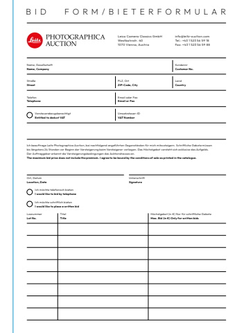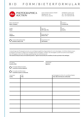 Ich m%u00f6chte telefonisch bieten I would like to bid by telephoneIch m%u00f6chte schriftlich bieten I would like to place a written bidOrt, Datum Location, DateUnterschrift SignatureIch beauftrage Leitz Photographica Auction, bei nachfolgend angef%u00fchrten Gegenst%u00e4nden f%u00fcr mich mitzusteigern. Schriftliche Gebote m%u00fcssenbis l%u00e4ngstens 24 Stunden vor Beginn der Versteigerung beim Versteigerer vorliegen. Das H%u00f6chstgebot versteht sich exklusive des Aufgelds.Der Auftraggeber erkennt die Versteigerungsbedingungen des Auktionshauses an.The maximum bid price does not include the premium. I agree to be bound by the conditions of sale as printed in the catalogue.Leica Camera Classics GmbH Westbahnstr. 401070 Vienna, Austriainfo@leitz-auction.comTel.: +43 1 523 56 59 18Fax: +43 1 523 56 59 88Name, GesellschaftName, Company Stra%u00dfeStreetTelefon Telephone Umsatzsteuer-IDVAT NumberKundennrCustomer No.Land CountryPLZ, OrtZIP-Code, CityEmail oder Fax Email or FaxBID FORM/BIETERFORMULARVorsteuerabzugsberechtigtEntitled to deduct VATLosnummerLot No.TitelTitleH%u00f6chstgebot (in %u20ac) Nur f%u00fcr schriftliche GeboteMax. Bid (in %u20ac) Only for written bids