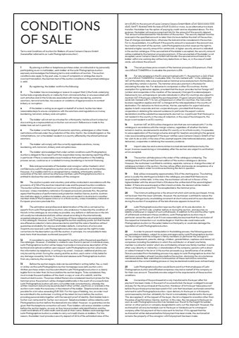 lot in EURO to the account of Leica Camera Classics GmbH IBAN: AT49 3200 0000 1355 4563; SWIFT: RLNWATWW for bids of EUR 10,000 or more. As an alternative to a banktransfer, the bidder has the option of paying by credit card as stipulated above. For this purpose, the bidder will receive a payment link for the amount of the security deposit. This amount will be blocked for the duration of the auction. The security deposit must be received in the specified account no later than 24 hours before the start of the auction, free of charges and deductions, otherwise the bid cannot be considered in the auction. For in-house bidders, it is sufficient if the security amount is received in the account one hour before the start of the auction. Leitz Photographica Auction reserves the right to demand a higher security amount for certain lots. A higher security amount is indicated in the auction catalogue. If the secured bid of the bidder is accepted, the security amount will be credited to the hammer price plus premium. If the secured bid of the bidder is not accepted, Leica Camera Classics GmbH will transfer the secured amount back to the bidder within one working day without any deductions or fees, or, in the case of credit cards, will unblock the amount.14 The net purchase price consists of the hammer price plus 20% premium, if bid via LIVEAUCTIONEERS or Invaluable the premium is 25%.15 For lots remaining in the EU and not marked with (*), the premium is 24% (if bid on via LIVEAUCTIONEERS or Invaluable 30%). For lots marked with * in the catalogue, VAT at the statutory rate is due and levied on hammer price and premium (full taxation), provided they remain in Austria. The hammer price plus premium is the basis for calculating the sales tax. For deliveries to companies in other EU countries, the tax exemption for ig deliveries applies, provided that the buyer provides his/her foreign VATnumber and cooperates in the creation of the necessary (transport) evidence/papers.Deliveries to non-entrepreneurs (private individuals) in other EU countries are subject to Austrian VAT if the buyer collects the purchased item. If Leica Camera Classics GmbH sends lots marked with (*) to non-entrepreneurs in other EU countries, the mail-order business regulation applies and VAT is charged at the rate applicable in the country of destination. For deliveries to third countries, the tax-exemption for export deliveries applies to both corporate and non-corporate buyers, provided that the buyer cooperates in obtaining the relevant evidence (in particular the export customs declaration) and the substantive requirements are met (i.e. in particular that the buyer is not resident in the country in the case of collection, in the case of tourist exports, the buyer is not resident in an EU country).16 Austrian VAT at 20% will be charged on lots that are not marked with (*) in the catalogue in accordance with the margin scheme, regardless of whether the items remain in Austria, are delivered to another EU country or to a third country. It is possible to waive application of the margin scheme and opt for taxation according to the general rules (see preceding paragraph) if the buyer notifies Leica Camera Classics GmbH of his/her wish to do so and, in the case of tax-exempt exports (international deliveries, export deliveries), cooperates in obtaining the necessary evidence. 17 Import sales tax and customs duties incurred abroad shall be borne by the buyer. Invoices issued during or immediately after the auction are subject to verification;errors excepted.18 The auction will take place in the order of the catalogue numbering. The catalogue text of the printed German edition of the auction catalogue is decisive. However, the auctioneer is entitled to combine, separate, remove or change the order of catalogue numbers in the auction. He may refuse offers and revoke an acceptance of a bid already made in order to continue auctioning the item in question. 19 Bids will be increased by approximately 10% of the starting price. The starting price is usually the starting price listed in the catalogue, provided that there are no several higher written bids. In this case, the auctioneer will call out in favour of the highest bidder with the amount that is 10% above the written bid of the second highest bidder. If there are several equal written maximum bids, the decision will be made in favour of the bid received first. The accepted bid is the hammer price.20 The minimum selling price is the amount at which a lot can be purchased. It may not be lower than the lower estimate. However, the auctioneer is entitled to reduce the minimum selling price by one bidding increment at short notice and at his own discretion during the auction if acceptance of the bid otherwise appears to be at risk.21 Leitz Photographica Auction reserves the right, at its sole discretion, to withdraw any lot from sale, whether before or during the auction, and assumes no liability whatsoever in respect of such withdrawals. In addition to this and the other rights of withdrawal contained in these conditions, Leitz Photographica Auction may in particular cancel the sale of a lot if it can reasonably be assumed that the conclusion of the respective transaction is or could be illegal or that the sale could make Leitz Photographica Auction (or the seller) liable to a third party or could also damage the reputation of Leitz Photographica Auction.22 In order to prevent manipulation in the bidding process, the following persons are excluded as bidders, subject to review and approval by Leitz Photographica Auction: a) The consignor and the consignor%u2019s family members (in particular the consignor'sspouse, grandparents, parents, siblings, children, grandchildren, nephews and nieces); b)companies (including foundations) in which the contributor or at least one family member is a director and/or which are controlled by at least one family member in someother way (directly or indirec
