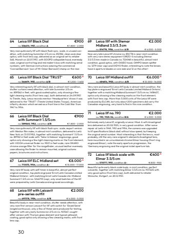 3069 Leica IIIf with Stemar %u20ac2.000Midland 3.5/3.3 cmno. 814778, 1956, condition A/B %u20ac 4.000 %u2013 5.000Nice very late Leica IIIf chrome no. 814778 in near-mint condition with very rare stereo equipment OIRZO-S including Stemar 3.5/3.3%u2009mm made in Canada no.%u20091124148 in beautiful, almost mintcondition, good optics, with OIGEO hood, OIMPO beam splitterno.%u20091279 (rear cap) and OIDYO finder, interesting to note the lenseshave 6 aperture blades on one side and 12 on the other!70 Leica IIIf Midland outfit %u20ac6.000*no. 684816, 1953, condition A/B %u20ac 12.000 %u2013 14.000Very rare and beautiful Leica IIIf body in almost mint condition, the top plate is engraved %u2018Ernst Leitz Canada Limited Midland Ontario%u2019, together with a matching Midland Summarit 1.5/5%u2009cm no.%u20091418407,optics only showing a few cleaning marks on the front element,with front lens cap. More than 5.000 units of the Leica IIIf were produced by ELCAN, but only about 200 specimens did carry the Canadian engraving, very hard to find in this nice condition.71 Leica IIf no.190 %u20ac2.000no.190, 1925-54, condition B/A %u20ac 4.000 %u2013 5.000Extremely early Leica IIf, originally a Leica I Mod. A with Anastigmatlens delivered on 20.02.1925, in very good condition. After some repair at Leitz in 1949, 1951 and 1954, the camera was upgraded to%u00a0IIf specifications (black dial) without slow speed, but keepingthe%u00a0original serial number. Most interesting is that the lens is, mostprobably, still the very rare original 5-elements Anastigmat lens, here mounted in an unnumbered chrome Elmar housing (front ring engraved Elmar), note the early aperture progression, the %u2018Germany engraving and the original nickel aperture%u00a0tab.72 Leica IIf black scale with %u20ac400*Elmar 3.5/5 cm no. 570777, 1951, condition A%u2013 %u20ac 800 %u2013 900Beautiful quite early black scale body, in mint condition, perfect vulcanite, together with matching Elmar 3.5/5%u2009cm no.%u2009907225 withvery good optics (front lens cap), both delivered to retailer W%u00fcnsche, Stutgart, on 20.12.1951.66 Leica IIIf Black Dial %u20ac900with Summarit 1.5/5 cmno. 589860, 1952, condition A/B %u20ac 1.800 %u2013 2.000Very nice quite early IIIf with black flash sync. scale, export versionwith Weston film index, in almost mint condition, delivered to LeitzNew York on 13.03.1952, together with matching Summarit 1.5/5%u2009cmno. 891961 in feet scale with %u2018Tailor & Hobson%u2019 engravings, good optics only showing a few light cleaning marks on the front element, with VIOOH universal finder no.%u20099501 in feet scale, rare OKAROchrome orange filter for the rangefinder, unusual leather evereadycase allowing the finder to remain mounted, original customspapers, brochures and instructions.67 Leica IIIf ELC Midland set %u20ac8.000*no. 710015, 1954, condition A%u2013 %u20ac 15.000 %u2013 17.000Very rare IIIf body with self-timer in beautiful, almost perfect original condition, top plate engraved %u2018Ernst Leitz Canada Limited Midland Ontario%u2019, with matching Ernst Leitz Canada Ltd. Midland Summarit 1.5/5%u2009cm no.%u20091246793 (cap), only small batches of the IIIfwere prepared by Leitz Canada and engraved accordingly.68 Leica IIIf with Leicavit %u20ac2.000pre-series outfitno. 697378, 1954, condition A/B %u20ac 4.000 %u2013 5.000Beautiful body in near-mint condition, shutter needs attention, withvery rare first version Leicavit for IIIf with switch for %u2018Einzel/Serie%u2019(single/continuous), only a few of these were produced for testing,together with very early Summicron 2/5%u2009cm no.%u2009921567, soughtafter version with Thorium glass element and typical yellowish coating, good optics only showing a few cleaning marks, with front lens cap.64 Leica IIIf Black Dial %u20ac900no. 536610, 1951, condition A %u20ac 1.800 %u2013 2.000Very nice quite early IIIf with black flash sync. scale, in unused%u00a0condition, with matching Summitar 2/5%u2009cm no.%u2009812182, clean and clearoptics, with%u00a0front lens cap, delivered as an original set to retailerS%u00fc%u00df, Munich on 22.01.1951, with SOOPD collapsible hood, eveready case, original control tag and red maker%u2019s box with matching serial numbers, with German instructions wearing the commercial %u2018Conrad Barnack%u2019 (son of Mr Oskar Barnack!) stamp on the rear.65 Leica IIIf Black Dial %u2018TRUST%u2019 %u20ac600*no. 566419, 1951, condition A/B %u20ac 1.200 %u2013 1.400Very interesting early IIIf with black dial, in almost mint condition, shutter curtains need attention, with late Summitar 2/5%u2009cmno. 859362 in feet, with good coated optics, only showing a few light cleaning marks (front lens cap), both delivered on 24.09.1951 to Trieste, Italy, Leica records mention %u2018Headquarters%u2019 shows it was delivered to the %u2018TRUST%u2019 (Trieste United States Troops), American infantry division which served as a front line in the Cold War from 1947 to 1954.