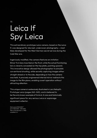 3273Leica If Spy Leica This extraordinary prototype Leica camera, based on the Leica If, was designed for discreet, undercover photography %u2014 most likely developed for the West German secret service during the Cold War era. Ingeniously modified, the camera features an imitationElmar%u00a09%u2009cm lens mounted on the front, while the actual functioninglens is cleverly concealed on the top plate, pointing upward. This innovative design allowed the photographer to simulate conventional shooting, while secretly capturing images either straight ahead or to the side, depending on how the camera was held. A precisely engineered internal mirror redirects the image to the film plane, enabling covert operation withoutattracting attention.This unique camera is extensively illustrated in Lars Netopil%u2019s Prototype Leica (pages 262%u2013265), and is believed to be the only known example of its kind. A rare and historicallysignificant piece for any serious Leica or espionageequipment collector.Start price %u20ac 80.000*est. %u20ac 150.000%u2013 200.000Year of production: c.1955condition: A%u2013