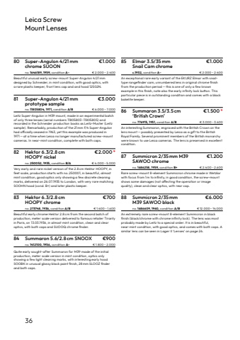 3680 Super-Angulon 4/21 mm %u20ac1.000chrome SUOONno.1646189, 1959, condition A%u2013 %u20ac 2.000 %u2013 2.400Beautiful unusual%u00a0early screw-mount Super-Angulon 4/21%u2009mmdesigned by Schneider, in mint condition, with good optics, witha rare plastic keeper, front lens cap%u00a0and and hood 12502N.81 Super-Angulon 4/21 mm %u20ac3.000prototype sampleno.11805804, 1971, condition A/B %u20ac 6.000 %u2013 7.000Leitz Super-Angulon in M39 mount, made in an experimental batch of only three lenses (serial numbers 11805803%u201311805805) and recorded in the Schneider production books as Leitz-Muster (Leitz sample). Remarkably, production of the 21%u2009mm f/4 Super-Angulonhad officially ceased in 1963, yet this example was produced in1971 %u2014 at a time when Leica no longer manufactured screw-mount cameras. In near-mint condition, complete with both caps.82 Hektor 6.3/2.8 cm %u20ac2.000*HOOPY nickel no. 250052, 1935, condition B/A %u20ac 4.000 %u2013 5.000Very%u00a0early and rare nickel version of the 2.8%u2009cm Hektor HOOPY, infeet scale, production starts with no. 250001, in beautiful, almost mint condition, good optics only showing a few discrete cleaning marks, delivered on 26.07.1935 to London, with very rare matching SOOHN hood (cond. B+) and later plastic keeper.83 Hektor 6.3/2.8 cm %u20ac700HOOPY chromeno. 273748, 1936, condition A/B %u20ac 1.400 %u2013 1.600Beautiful early%u00a0chrome%u00a0Hektor 2.8%u2009cm from the second%u00a0batch ofproduction, meter scale version delivered to famous retailer Tiranty in Paris, on 13.03.1936, in almost%u00a0mint condition,%u00a0clean and clearoptics, with both caps and SUOOQ chrome finder.84 Summaron 5.6/2.8 cm SNOOX %u20ac900no.1412100, 1956, condition A%u2013 %u20ac 1.800 %u2013 2.000Quite early sought-after Summaron for M39 made of the initial production, meter%u00a0scale version in mint condition, optics onlyshowing a few light cleaning marks, with interesting early hood SOOBK in unusual glossy black paint finish, 28%u2009mm SLOOZ finderand both caps.Leica ScrewMount Lenses85 Elmar 3.5/35 mm %u20ac1.000Snail Cam chromec.1932, condition A%u2013 %u20ac 2.000 %u2013 2.400An exceptional rare early variant of the EKURZ Elmar with%u00a0snailtype rangefinder cam, unnumbered lens in original chrome finishfrom the production period %u2014 this is one of only a few known example in this finish, note also the early infinity lock button. Thisparticular piece is in outstanding condition and comes with a black bakelite keeper.86 Summaron 3.5/3.5 cm %u20ac1.500*%u2018British Crown%u2019 no. 776915, 1951, condition A/B %u20ac 3.000 %u2013 3.400An interesting Summaron, engraved with the British Crown on the lens mount %u2014 possibly presented by Leica as a gift to the British Royal Family. Several prominent members of the British monarchy were known to use Leica cameras. The lens is preserved in excellent condition.87 Summicron 2/35 mm M39 %u20ac1.200SAWOO chromeno.1686258, 1959, condition B+ %u20ac 2.400 %u2013 2.600Rare screw-mount 8-element Summicron chrome made in Wetzlar with focus from 1%u2009m to infinity, in good condition, the screw-mountshows some damages (not affecting the operation or imagequality), clean and clear optics, with rear cap.88 Summicron 2/35 mm %u20ac6.000M39 SAWOO blackno.1686609, 1960, condition A/B %u20ac 12.000 %u2013 14.000An extremely rare screw-mount 8-element Summicron in black finish (black/chrome with chrome infinity lock). The lens was mostprobably made by Leitz to a special order. It is in beautiful, near-mint condition, with good optics, and comes with both caps. A similar lens can be seen in Lager II %u2018Lenses%u2019 on page 26.