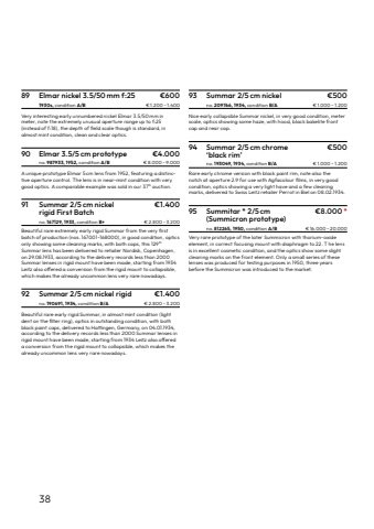 3889 Elmar nickel 3.5/50 mm f:25 %u20ac6001930s, condition A/B %u20ac 1.200 %u2013 1.400Very interesting early unnumbered nickel Elmar 3.5/50%u2009mm inmeter, note the extremely unusual aperture range up to f:25 (instead of f:18), the depth of field scale though is standard, inalmost mint condition, clean and clear optics.90 Elmar 3.5/5 cm prototype %u20ac4.000no. 987933, 1952, condition A/B %u20ac 8.000 %u2013 9.000A unique prototype Elmar 5 cm lens from 1952, featuring a distinctive aperture control. The lens is in near-mint condition with very good optics. A comparable example was sold in our 37th auction.91 Summar 2/5 cm nickel %u20ac1.400rigid First Batchno.167129, 1933, condition B+ %u20ac 2.800 %u2013 3.200Beautiful rare extremely early rigid Summar from the very firstbatch%u00a0of production (nos.%u2009167001-168000), in good condition, opticsonly showing some%u00a0cleaning marks, with both caps, this 129thSummar lens has been delivered to retailer Nordisk, Copenhagen, on 29.08.1933, according to the delivery records less than 2000 Summar lenses in rigid mount have been made, starting from 1934 Leitz also offered a conversion from the rigid mount to collapsible,which makes the already uncommon lens very rare nowadays.92 Summar 2/5 cm nickel rigid %u20ac1.400no.190691, 1934, condition B/A %u20ac 2.800 %u2013 3.200Beautiful rare early rigid Summar, in%u00a0almost mint condition%u00a0(lightdent on the filter ring), optics in outstanding condition, with bothblack paint caps, delivered to Hattingen, Germany, on 04.01.1934,according to the delivery records less than 2000 Summar lenses in rigid mount have been made, starting from 1934 Leitz also offereda conversion from the rigid mount to collapsible, which makes the already uncommon lens very rare nowadays.93 Summar 2/5 cm nickel %u20ac500no. 209766, 1934, condition B/A %u20ac 1.000 %u2013 1.200Nice%u00a0early collapsible Summar nickel, in%u00a0very good condition, meterscale, optics showing some haze, with hood, black bakelite front cap and rear cap.94 Summar 2/5 cm chrome %u20ac500%u2018black rim%u2019no.193049, 1934, condition B/A %u20ac 1.000 %u2013 1.200Rare early chrome version with black paint rim, note also thenotch at aperture 2.9 for use with Agfacolour films, in very goodcondition, optics showing a very light have and a few cleaning marks, delivered to Swiss Leitz retailer Perrot in Biel on 08.02.1934.95 Summitar * 2/5 cm %u20ac8.000*(Summicron prototype) no. 812265, 1950, condition A/B %u20ac 16.000 %u2013 20.000Very rare prototype of the later Summicron with thorium-oxide element, in correct focusing mount with diaphragm to 22. T he lens is in excellent cosmetic condition, and the optics show some slight cleaning marks on the front element. Only a small series of these lenses was produced for testing purposes in 1950, three years before the Summicron was introduced to the market.