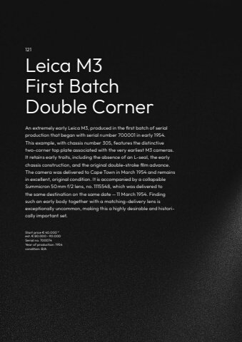46121Leica M3 First Batch Double Corner An extremely early Leica M3, produced in the first batch of serialproduction that began with serial number 700001 in early 1954. This example, with chassis number 305, features the distinctive two-corner top plate associated with the very earliest M3 cameras. It retains early traits, including the absence of an L-seal, the early chassis construction, and the original double-stroke film advance.The camera was delivered to Cape Town in March 1954 and remains in excellent, original condition. It is accompanied by a collapsible Summicron 50%u2009mm f/2 lens, no.%u20091115548, which was delivered tothe same destination on the same date %u2014 11 March 1954. Finding such an early body together with a matching-delivery lens isexceptionally uncommon, making this a highly desirable and historically important set.Start price %u20ac 40.000*est. %u20ac 80.000%u2013 90.000Serial no. 700074Year of production: 1954condition: B/A