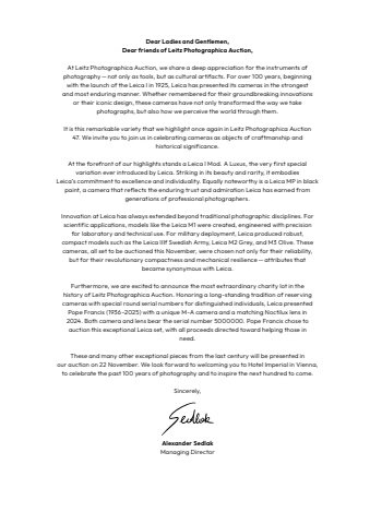 Dear Ladies and Gentlemen,Dear friends of Leitz Photographica Auction,At Leitz Photographica Auction, we share a deep appreciation for the instruments ofphotography %u2014 not only as tools, but as cultural artifacts. For over 100 years, beginningwith the launch of the Leica I in 1925, Leica has presented its cameras in the strongestand most enduring manner. Whether remembered for their groundbreaking innovationsor their iconic design, these cameras have not only transformed the way we takephotographs, but also how we perceive the world through them.It is this remarkable variety that we highlight once again in Leitz Photographica Auction47. We invite you to join us in celebrating cameras as objects of craftmanship andhistorical significance.At the forefront of our highlights stands a Leica I Mod. A Luxus, the very first specialvariation ever introduced by Leica. Striking in its beauty and rarity, it embodiesLeica%u2019s commitment to excellence and individuality. Equally noteworthy is a Leica MP in blackpaint, a camera that reflects the enduring trust and admiration Leica has earned fromgenerations of professional photographers.Innovation at Leica has always extended beyond traditional photographic disciplines. Forscientific applications, models like the Leica M1 were created, engineered with precisionfor laboratory and technical use. For military deployment, Leica produced robust,compact models such as the Leica IIIf Swedish Army, Leica M2 Grey, and M3 Olive. Thesecameras, all set to be auctioned this November, were chosen not only for their reliability,but for their revolutionary compactness and mechanical resilience %u2014 attributes thatbecame synonymous with Leica.Furthermore, we are excited to announce the most extraordinary charity lot in thehistory of Leitz Photographica Auction. Honoring a long-standing tradition of reservingcameras with special round serial numbers for distinguished individuals, Leica presentedPope Francis (1936%u20132025) with a unique M-A camera and a matching Noctilux lens in2024. Both camera and lens bear the serial number 5000000. Pope Francis chose toauction this exceptional Leica set, with all proceeds directed toward helping those inneed.These and many other exceptional pieces from the last century will be presented inour auction on 22 November. We look forward to welcoming you to Hotel Imperial in Vienna,to celebrate the past 100 years of photography and to inspire the next hundred to come.Sincerely,Alexander SedlakManaging Director