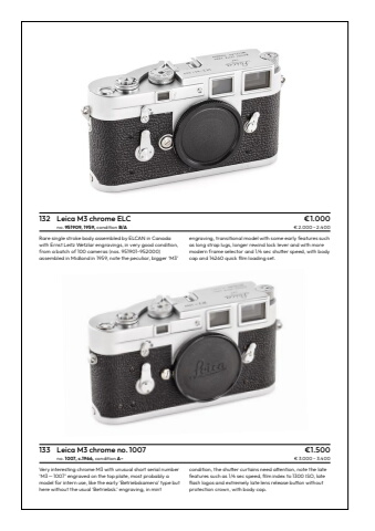 132 Leica M3 chrome ELC %u20ac1.000no. 951909, 1959, condition B/A %u20ac 2.000 %u2013 2.400Rare single stroke body assembled by ELCAN in Canada with Ernst Leitz Wetzlar engravings, in very good condition, from a batch of 100 cameras (nos. 951901-952000) assembled in Midland in 1959, note the peculiar, bigger %u2018M3%u2019 engraving, transitional model with some early features such as long strap lugs, longer rewind lock lever and with more modern frame selector and 1/4 sec shutter speed, with bodycap and 14260 quick film loading set.133 Leica M3 chrome no.1007 %u20ac1.500no.1007, c.1966, condition A%u2013 %u20ac 3.000 %u2013 3.400Very interesting chrome M3 with unusual short serial number %u2018M3 %u2014 1007%u2019 engraved on the top plate, most probably a model for intern use, like the early %u2018Betriebskamera%u2019 type but here without the usual %u2018Betriebsk.%u2019 engraving, in mint condition, the shutter curtains need attention, note the latefeatures such as 1/4 sec speed, film index to 1300 ISO, lateflash logos and extremely late lens release button withoutprotection crown, with body cap.