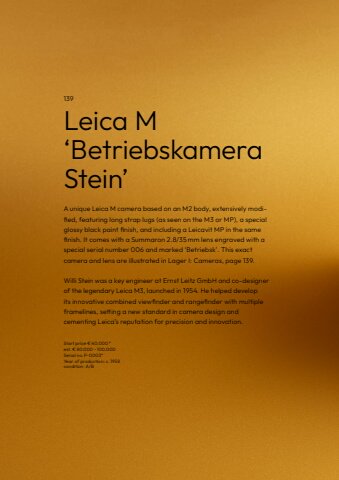 60139Leica M %u2018Betriebskamera Stein%u2019 A unique Leica M camera based on an M2 body, extensively modified, featuring long strap lugs (as seen on the M3 or MP), a specialglossy black paint finish, and including a Leicavit MP in the samefinish. It comes with a Summaron 2.8/35%u2009mm lens engraved with aspecial serial number 006 and marked %u2018Betriebsk%u2019. This exact camera and lens are illustrated in Lager I: Cameras, page 139. Willi Stein was a key engineer at Ernst Leitz GmbH and co-designer of the legendary Leica M3, launched in 1954. He helped develop its innovative combined viewfinder and rangefinder with multipleframelines, setting a new standard in camera design andcementing Leica%u2019s reputation for precision and innovation.Start price %u20ac 40.000*est. %u20ac 80.000%u2013 100.000Serial no. P-0003*Year of production: c.1958condition: A/B