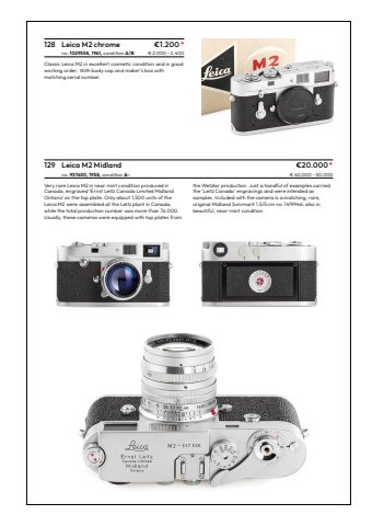 128 Leica M2 chrome %u20ac1.200*no.1029558, 1961, condition A/B %u20ac 2.000 %u2013 2.400Classic Leica M2 in excellent cosmetic condition and in good working order. With body cap and maker%u2019s box with matching serial number.129 Leica M2 Midland %u20ac20.000*no. 937630, 1958, condition A%u2013 %u20ac 40.000 %u2013 50.000Very rare Leica M2 in near mint condition produced in Canada, engraved %u2018Ernst Leitz Canada Limited Midland Ontario%u2019 on the top plate. Only about 1,500 units of the Leica M2 were assembled at the Leitz plant in Canada, while the total production number was more than 76.000. Usually, these cameras were equipped with top plates from the Wetzlar production. Just a handful of examples carried the %u2018Leitz Canada%u2019 engravings and were intended as samples. Included with the camera is a matching, rare, original Midland Summarit 1.5/5 cm no.1419946, also in beautiful, near-mint condition.