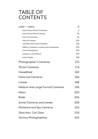 TABLE OFCONTENTSLeitz%u2009%u2014%u2009Leica 6Leica Screw Mount Cameras 6Leica Screw Mount Lenses 36Leica M Cameras 44Leica M Lenses 106Leicaflex and Leica R System 126Military Cameras, Lenses and Accessories 130Leica Accessories 150Lenses in Leica Mount 158Leica Copies 168Photographer%u2019s Cameras 17235%u2009mm Cameras 176Hasselblad 182Historical Cameras 184Lenses 188Medium and Large Format Cameras 196Nikon 200Rollei 204Soviet Cameras and Lenses 208Miniature and Spy Cameras 214Zeiss Ikon, Carl Zeiss 218Various Photographica 224