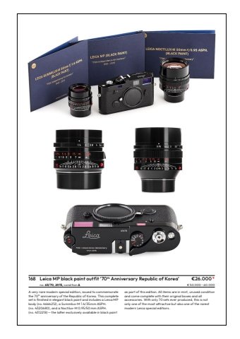 168 Leica MP black paint outfit %u201870th Anniversary Republic of Korea%u2019 %u20ac26.000*no. 65/70, 2015, condition A %u20ac 50.000 %u2013 60.000A very rare modern special edition, issued to commemorate the 70th anniversary of the Republic of Korea. This complete set is finished in elegant black paint and includes a Leica MPbody (no. 4666212), a Summilux-M 1.4/35 mm ASPH. (no. 4320680), and a Noctilux-M 0.95/50 mm ASPH. (no.%u20094312218)%u2009%u2014%u2009the latter exclusively available in black paintas part of this edition. All items are in mint, unused condition and come complete with their original boxes%u00a0and allaccessories. With only 70 sets ever produced, this is not only one of the most attractive but also one of the rarestmodern Leica special editions.