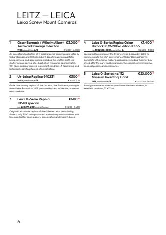 61 Oscar Barnack / Wilhelm Albert %u20ac3.000*Technical Drawings collection1930s, condition A/B %u20ac 5.000 %u2013 6.000An exceptional collection of 11 original pencil drawings and notes by Oskar Barnack and Wilhelm Albert, depicting various parts for Leica cameras and accessories, including the shutter shaft andshutter release spring, etc.. Each sheet measures approximately10%u00d7 14 cm and is preserved in excellent condition. A fascinating and historically significant piece of Leica history.2 Ur-Leica Replica 940231 %u20ac300*1980s, condition A/B %u20ac 600 %u2013 700Quite rare dummy replica of the Ur-Leica, the first Leica prototypefrom Oskar Barnack in 1913, produced by Leitz in Wetzlar, in almost mint condition.3 Leica 0-Serie Replica %u20ac600*10500 specialno. 2678277, 2001, condition A%u2013 %u20ac 1.200 %u2013 1.400Original Leitz-made replica of the 0-Series Leica (with folding finder), only 2000 units produced, in absolutely%u00a0mint condition, withlens cap, leather case, papers, presentation and maker%u2019s boxes.4 Leica 0-Series Replica Oskar %u20ac1.400*Barnack 1879-2004 Edition 10555no. 3002580, 2004, condition A %u20ac 2.600 %u2013 3.000Special edition replica of the 0-Series Type 2, issued in 2004 to commemorate the 125th anniversary of Oskar Barnack%u2019s birth. Complete with original maker%u2019s packaging, including the inner box styled after the early red Leica boxes, the special commemorative book, all papers, and accessories.5 Leica 0-Series no.112 %u20ac20.000*Museum Inventory Card1938, condition A/B %u20ac 30.000 %u2013 34.000An original museum inventory card from the Leitz Museum, in excellent condition, 12 %u00d7 17 cm.LEITZ %u2014 LEICALeica Screw Mount Cameras