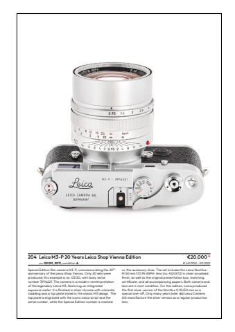 204 Leica M3-P 20 Years Leica Shop Vienna Edition %u20ac20.000*no.03/20, 2011, condition A %u20ac 40.000 %u2013 50.000Special Edition film camera M3-P, commemorating the 20thanniversary of the Leica Shop Vienna. Only 20 sets were produced; this example is no.%u200903/20, with body serialnumber 3976221. The camera is a modern reinterpretation of the legendary Leica M3, featuring an integrated exposure meter. It is finished in silver chrome with vulcanitecladding and a top plate styled in the classic M3 design. The top plate is engraved with the iconic Leica script and the serial number, while the Special Edition number is marked on the accessory shoe. The set includes the Leica NoctiluxM 50%u2009mm f/0.95 ASPH. lens (no.%u20094120572) in silver anodisedfinish, as well as the original presentation box, matchingcertificate, and all accompanying papers. Both camera andlens are in mint condition. For this edition, Leica produced the first silver version of the Noctilux 0.95/50%u2009mm as aspecial one-off. Only many years later did Leica CameraAG manufacture the silver version as a regular production lens.